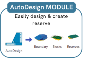 This will design the pit automatically from a selected nested pit shell, within a boundary. It will also create strips and blocks for stratified deposit mines or will create mining blocks/units(solids) for other mines. The design attributes of bench height, berm width, and wall slope angle will be parameterized so that they can be changed easily instead of redesigning. This module will also include reserving along with updating the quality of mineable blocks, considering loss and dilution. Finally, it will prepare a ROM model ready for scheduling. Once completed this will be one of the most powerful tools in mine planning.