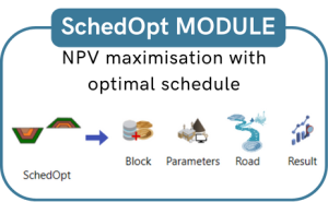 SchedOpt module uses design outputs from any software like Minex, Deswik, Vulcan, etc. in CSV format. The input consists of pit and dump block centroid coordinates along with volume and tonnage details and the main haul road center line. Other inputs consist of mining and processing capacity, costs, and sale price. The software calculates the possible ‘shortest path’ haulage roads for connecting all pit blocks to destination dump blocks, plants, and stockpiles, and traverses along existing haul roads provided, making estimates close to reality. Optimum paths are selected for each period by source blocks and destination dump, stockpile, or plant.